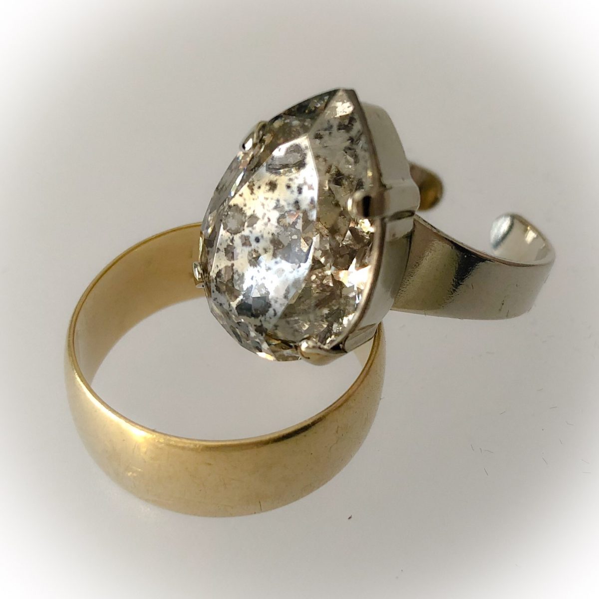 Nikkelitön, säädettävä sormus. Swarovski pear shaped 18x13mm, crystal silver patina.